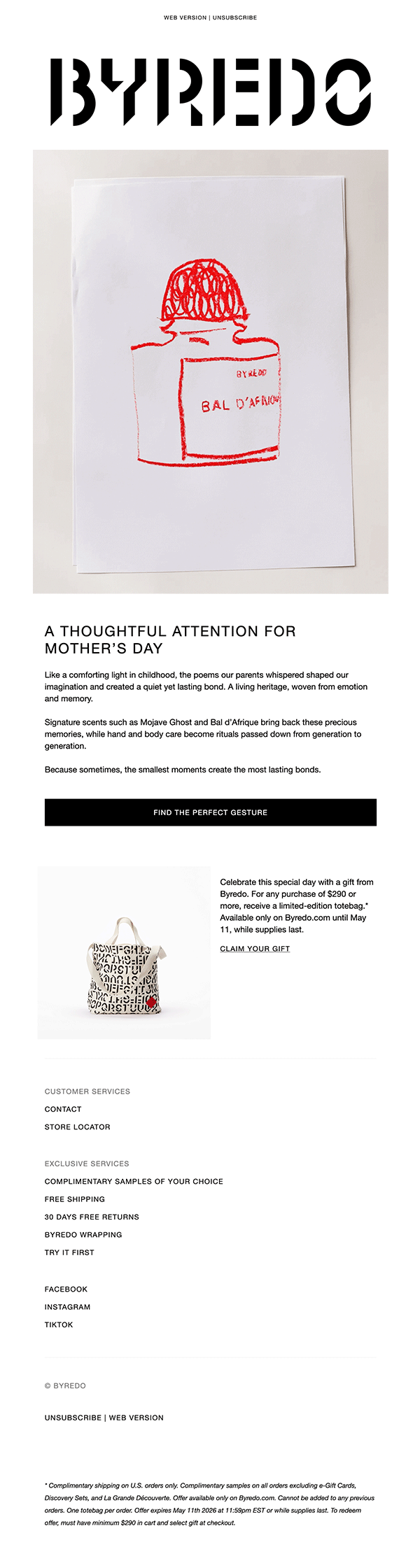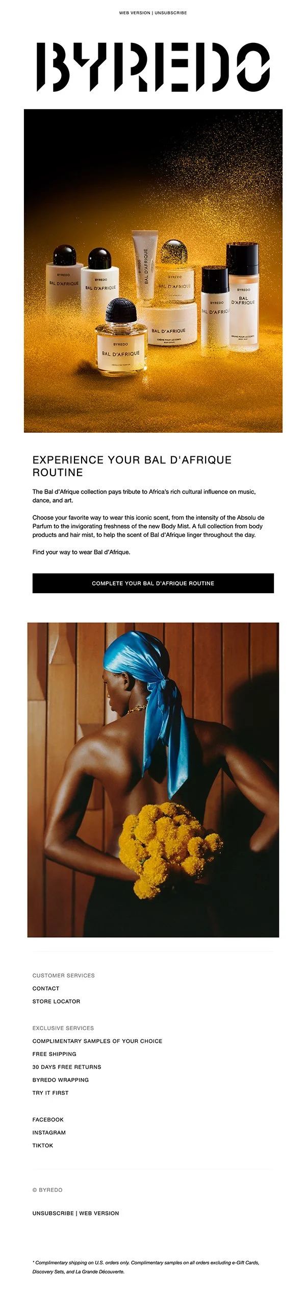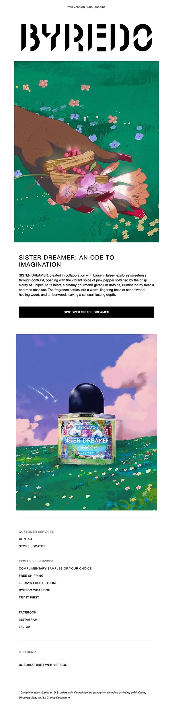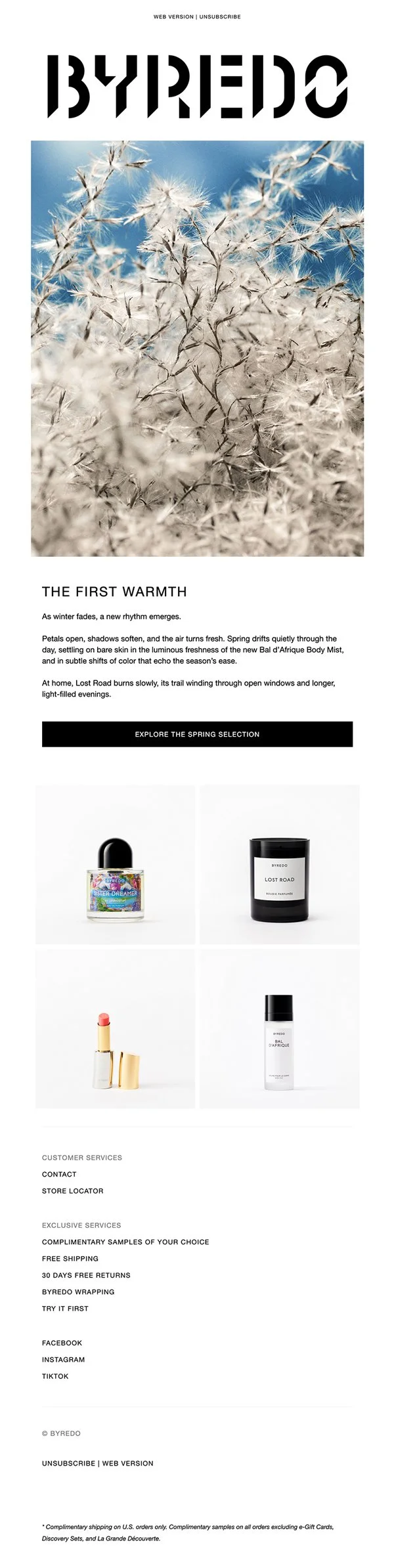 For Byredo, I crafted a series of editorial-driven emails that lean into the brandβs signature minimalist aesthetic to evoke the deep emotional narratives behind each scent, I focused on building a sense of product mystique through sophisticated storytelling and high-contrast visuals that transform a standard promotion into a premium brand experience, and I ensured every layout maintained a delicate balance between atmospheric imagery and intentional whitespace to guide the viewer through the unique lore of the fragrance house.