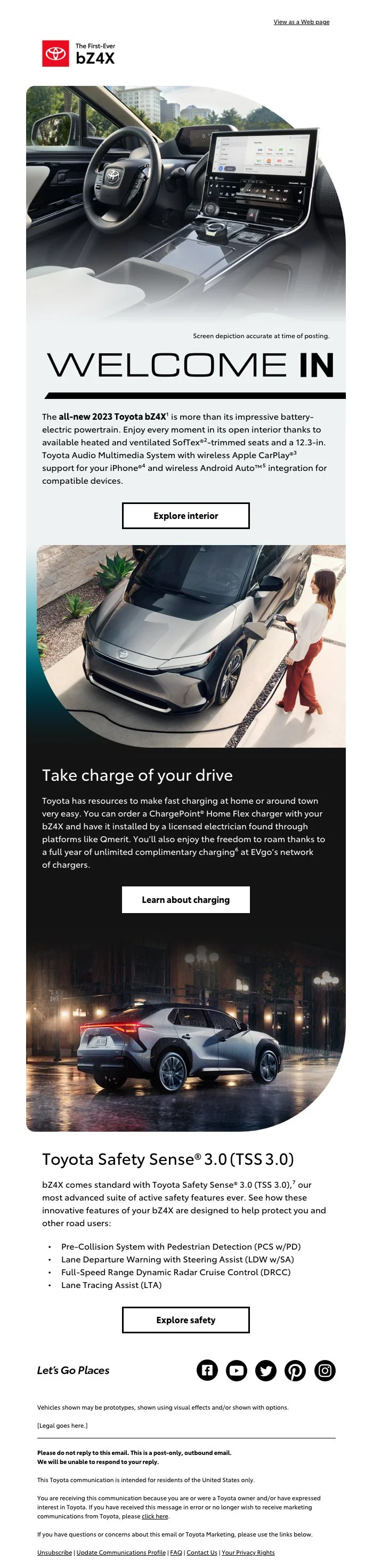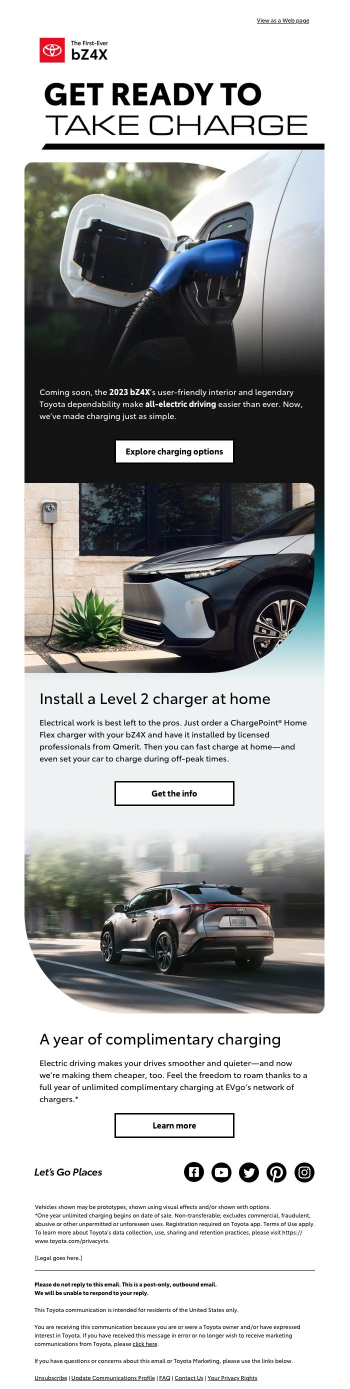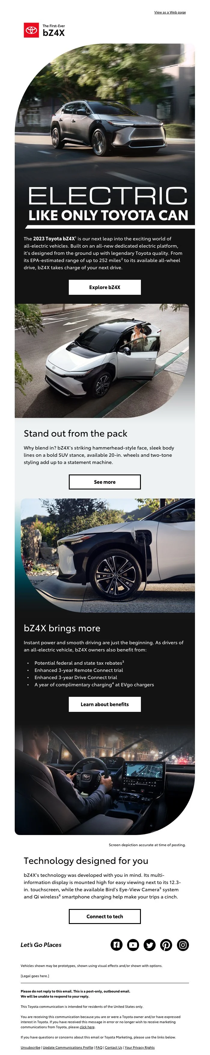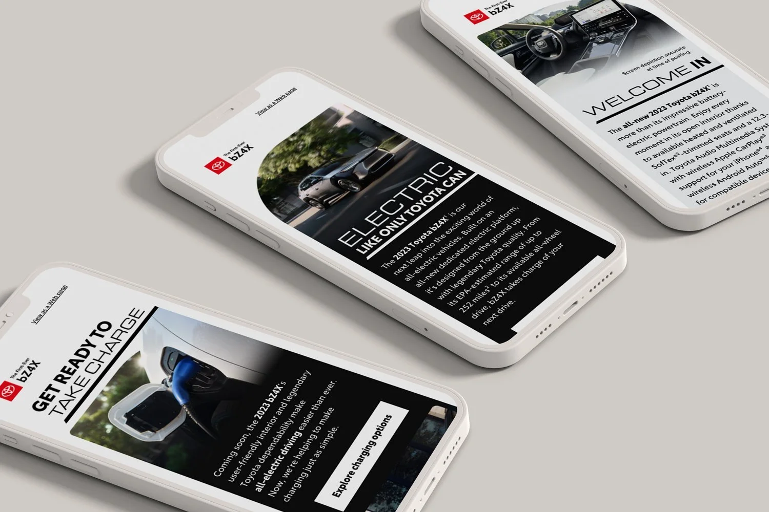 In 2019, the bZ4X joined the Toyota lineup as the manufacturerโs first-ever all-electric SUV. To support the launch of this vehicle, Toyota requested a multi-touch email campaign focusing on how the bZ4X is an electrifying change that drivers will embrace.