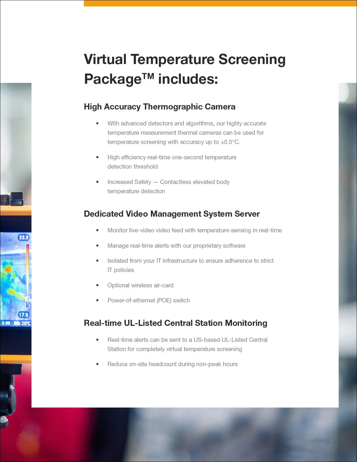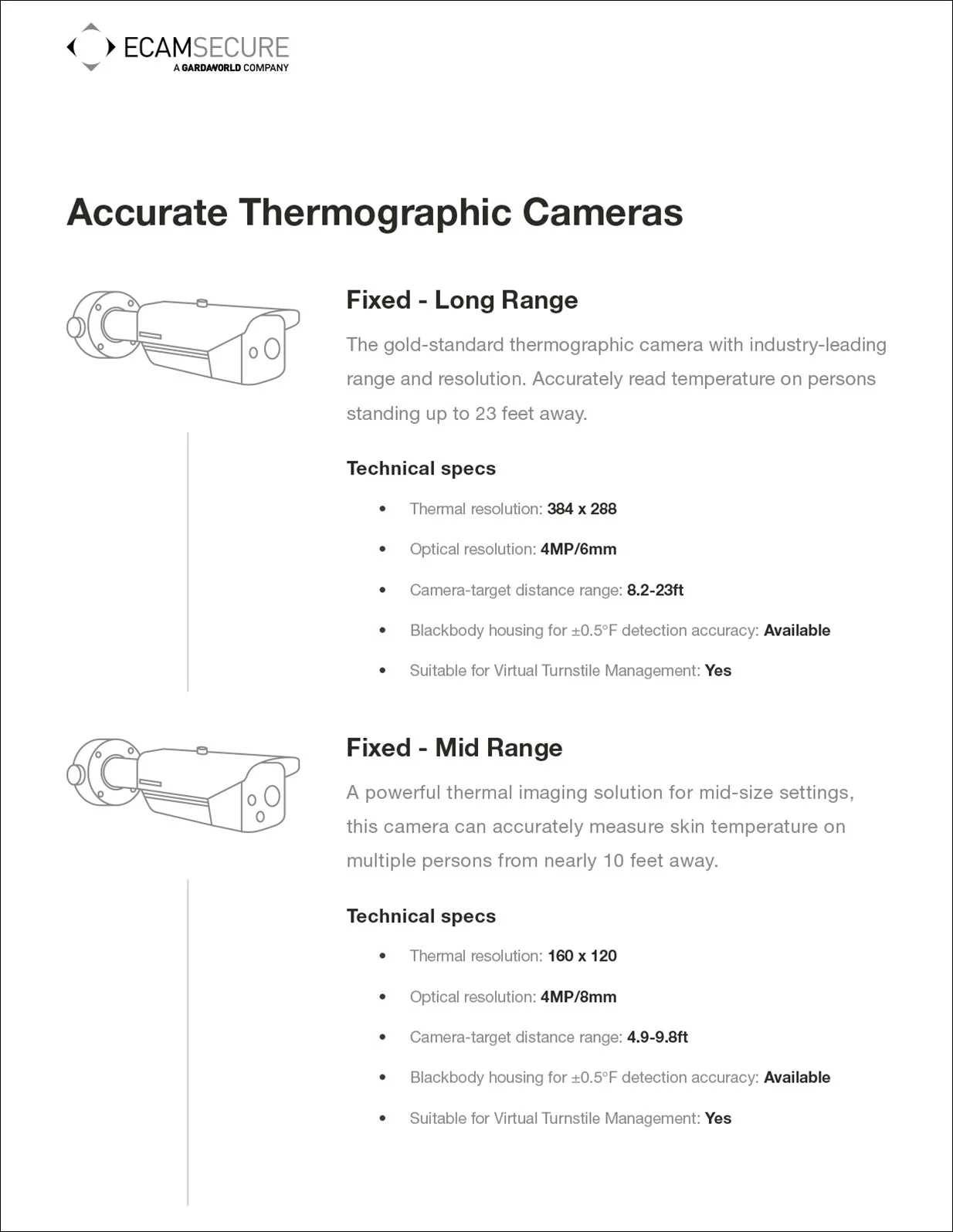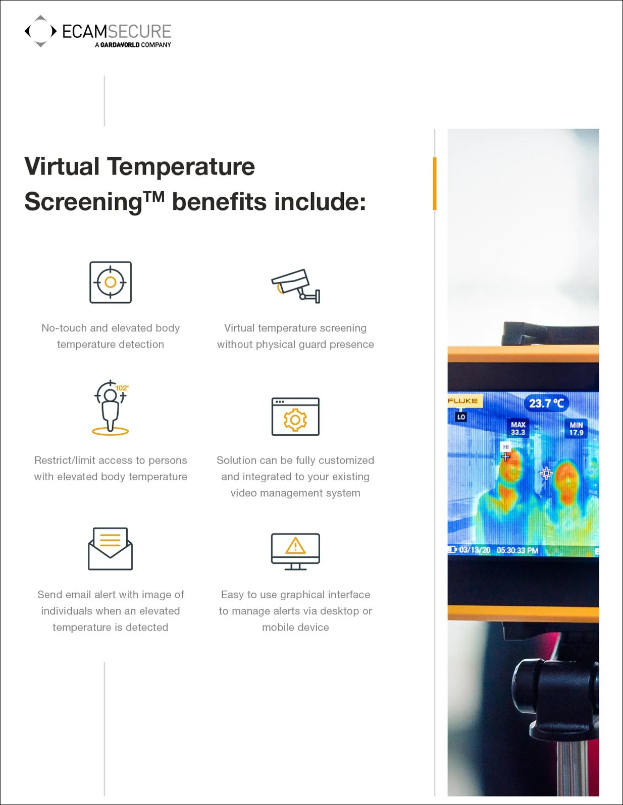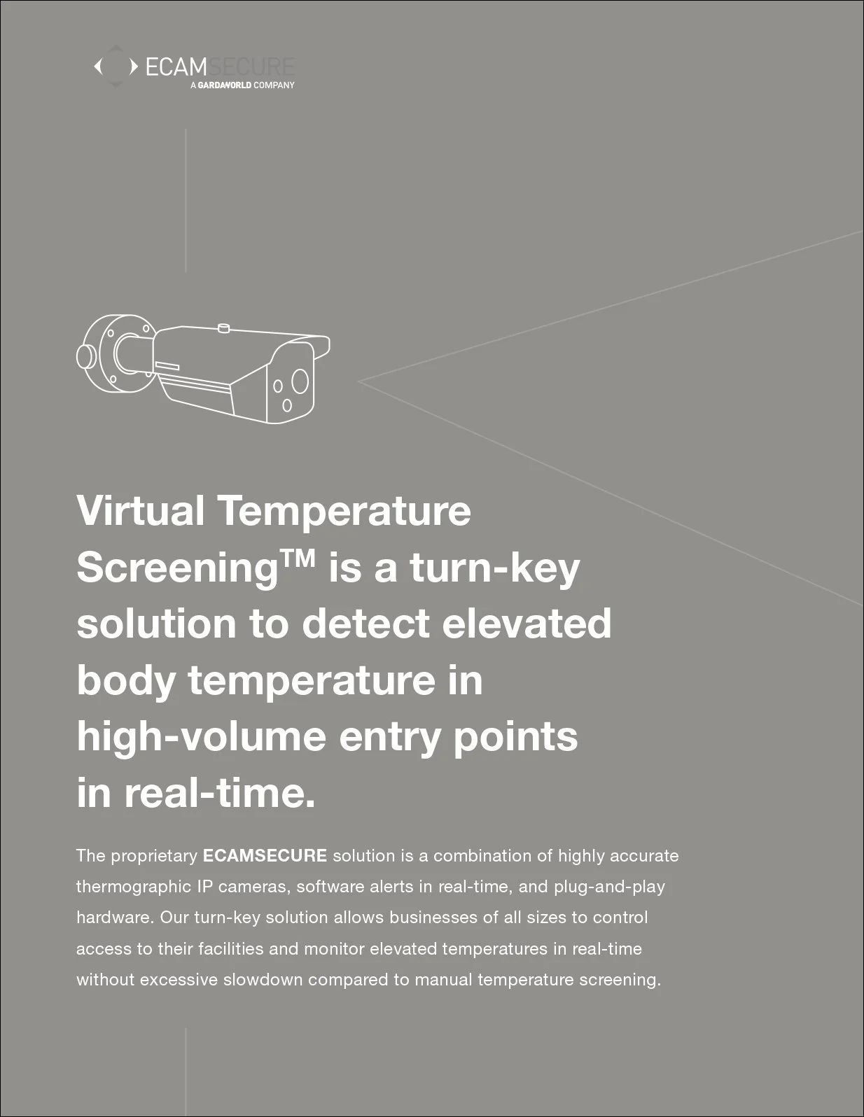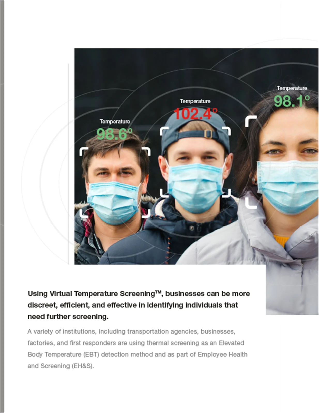 In 2020, I partnered with ECAMSECURE—a leader in remote surveillance and security solutions—to design a 14-page digital brochure promoting their Virtual Temperature Screening system. Created in direct response to the COVID-19 pandemic, the system allows businesses to discreetly and remotely monitor the body temperature of individuals entering their locations. The brochure was designed to clearly communicate the product’s benefits and functionality, with a clean, modern layout that aligned with ECAMSECURE’s tech-forward brand.