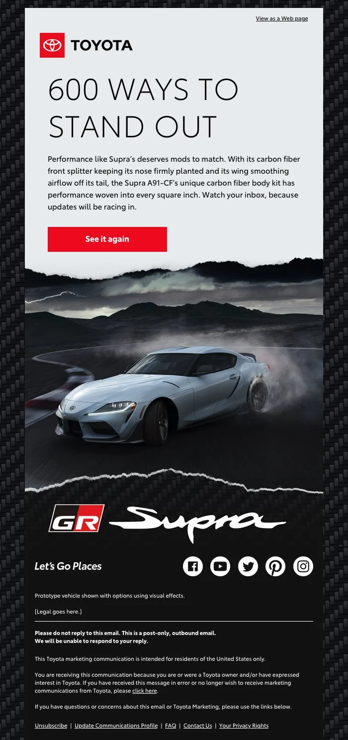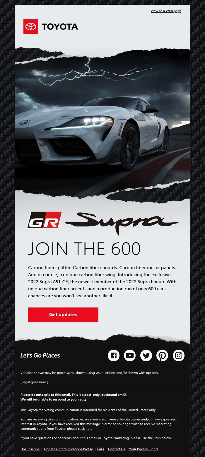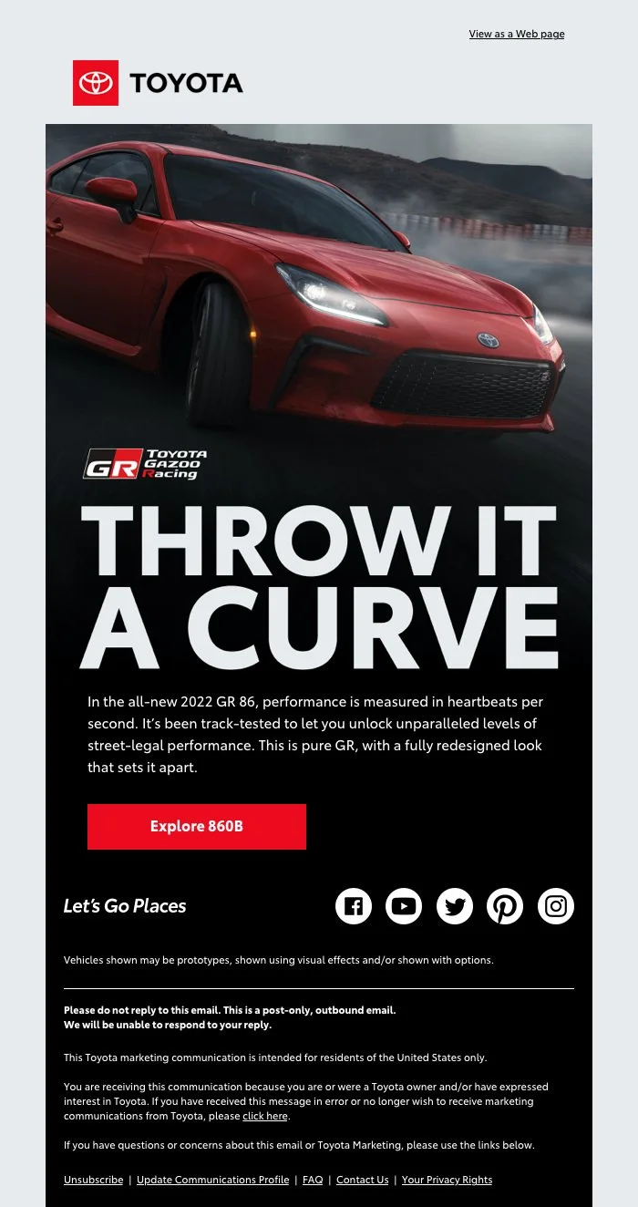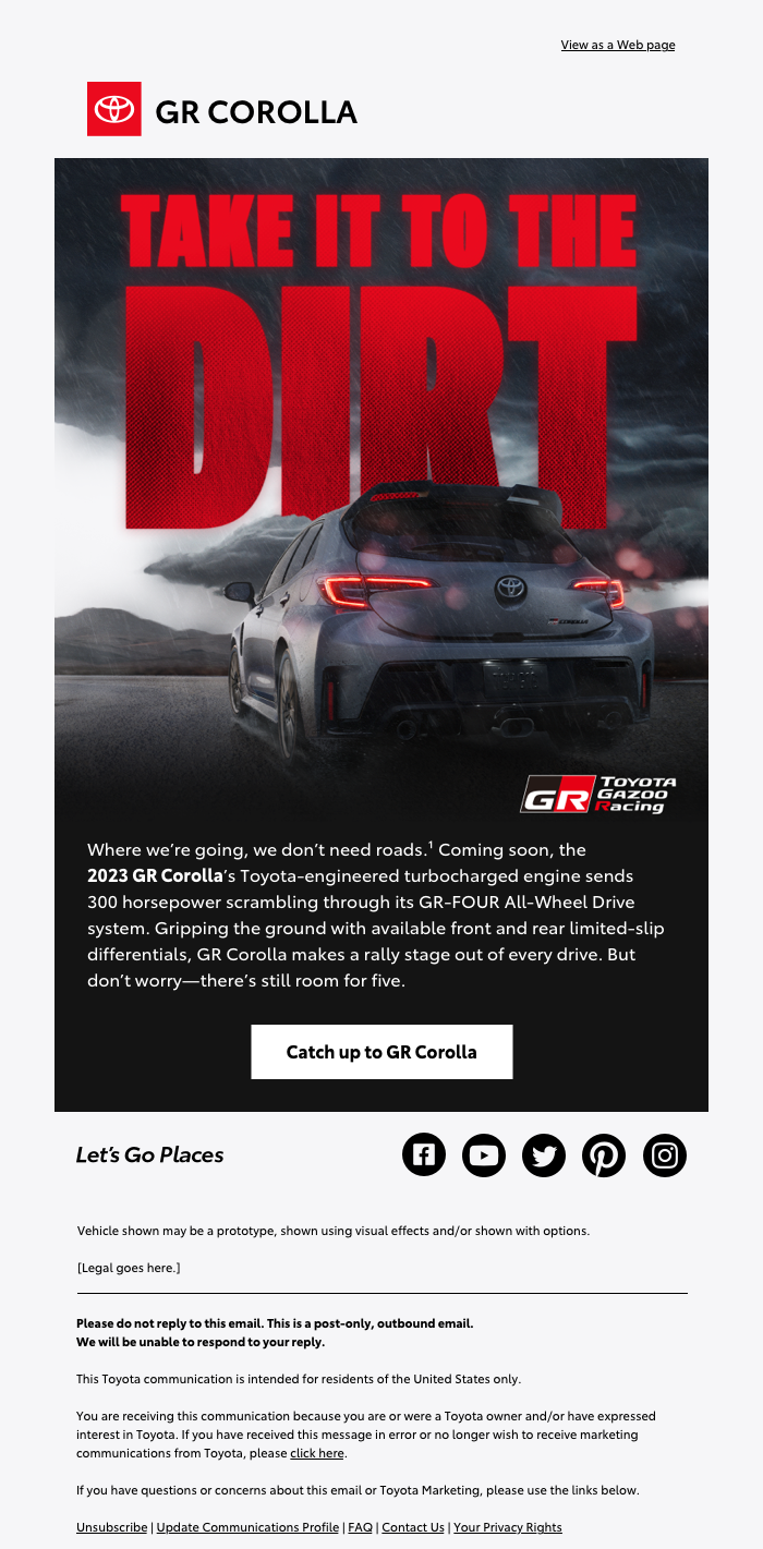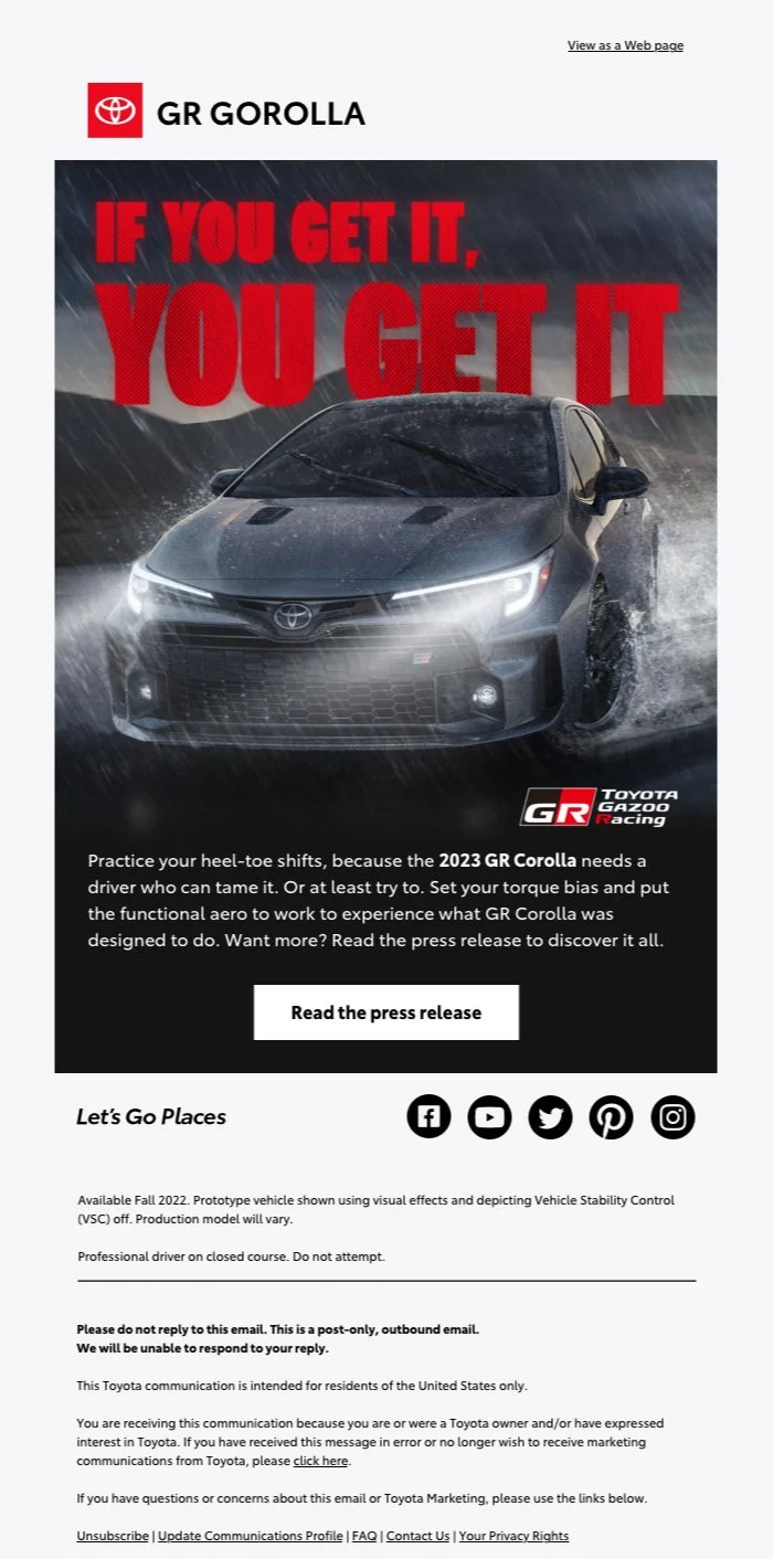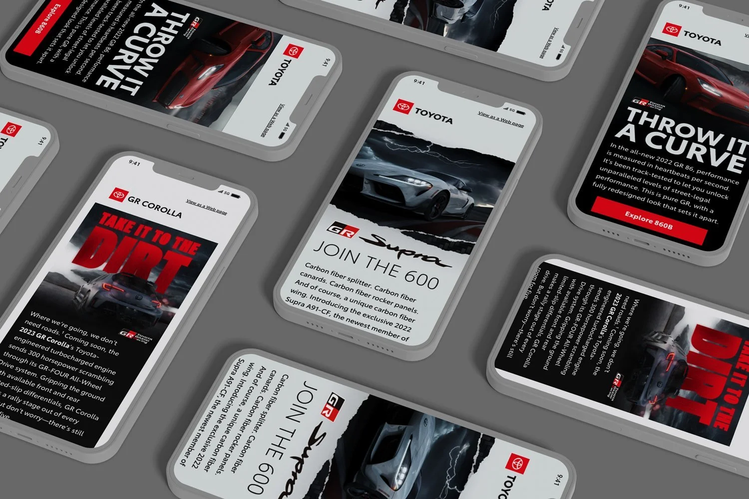 In 2020, Toyota optimized their Gazoo Racing lineup with three new family members: the Supra A91-CF Edition, the all-new GR86 and the first-ever GR Corolla. To support the reveals of these high-performance new vehicles, we designed heart-pumping two-touch campaigns for each vehicle.