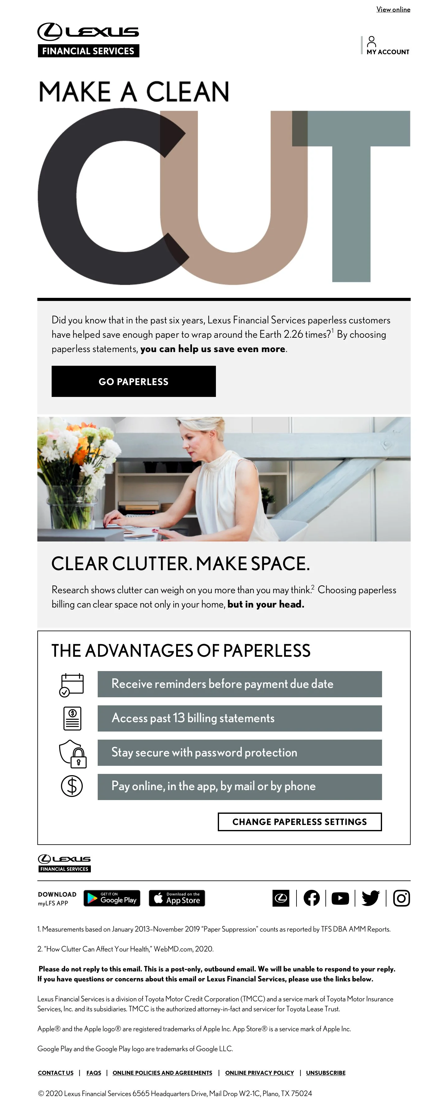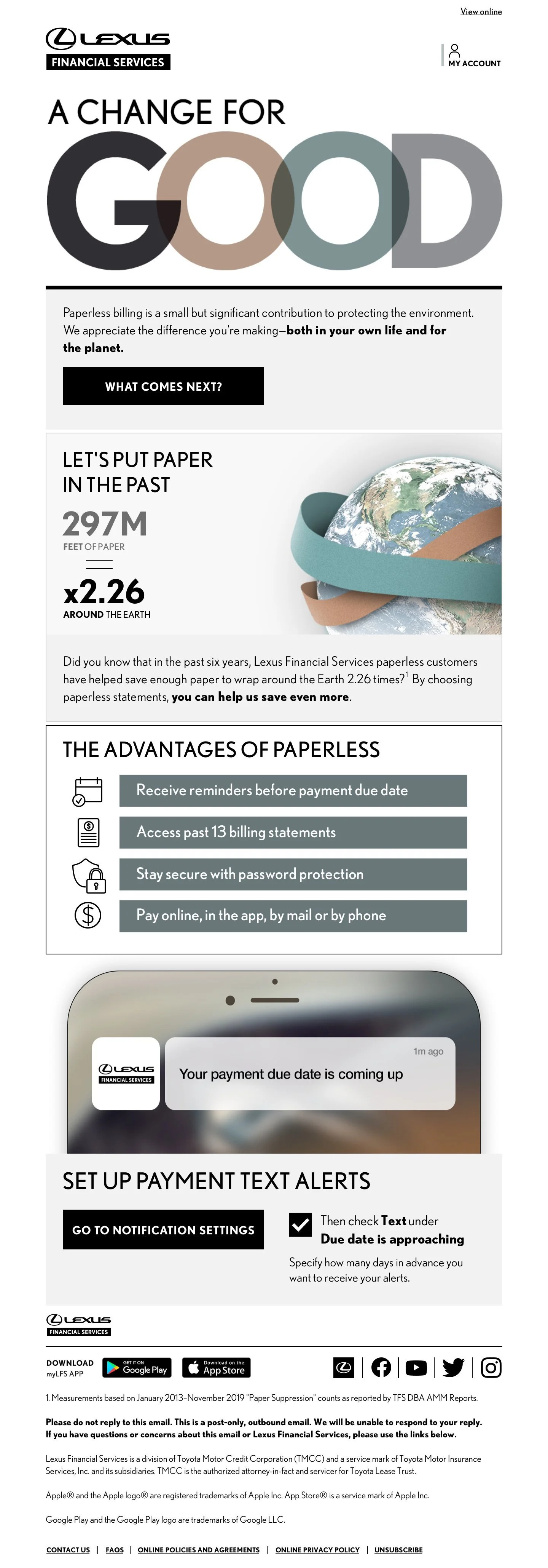 As part of Lexus' sustainability efforts, we crafted a two-touch email campaign encouraging owners to switch to paperless billing. With a focus on the environmental impact, the campaign uses clear and engaging messaging to inspire Lexus owners to make the change and support a greener future.
