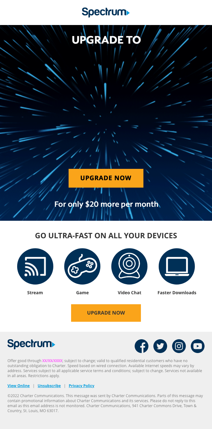 For Charter Communications, we created an impactful email showcasing Spectrum Ultraβan ultra-high-speed internet plan designed specifically for commercial residents. The email emphasizes the speed, reliability, and business-focused benefits of Spectrum Ultra, clearly communicating its value for professionals who demand seamless, uninterrupted connectivity.