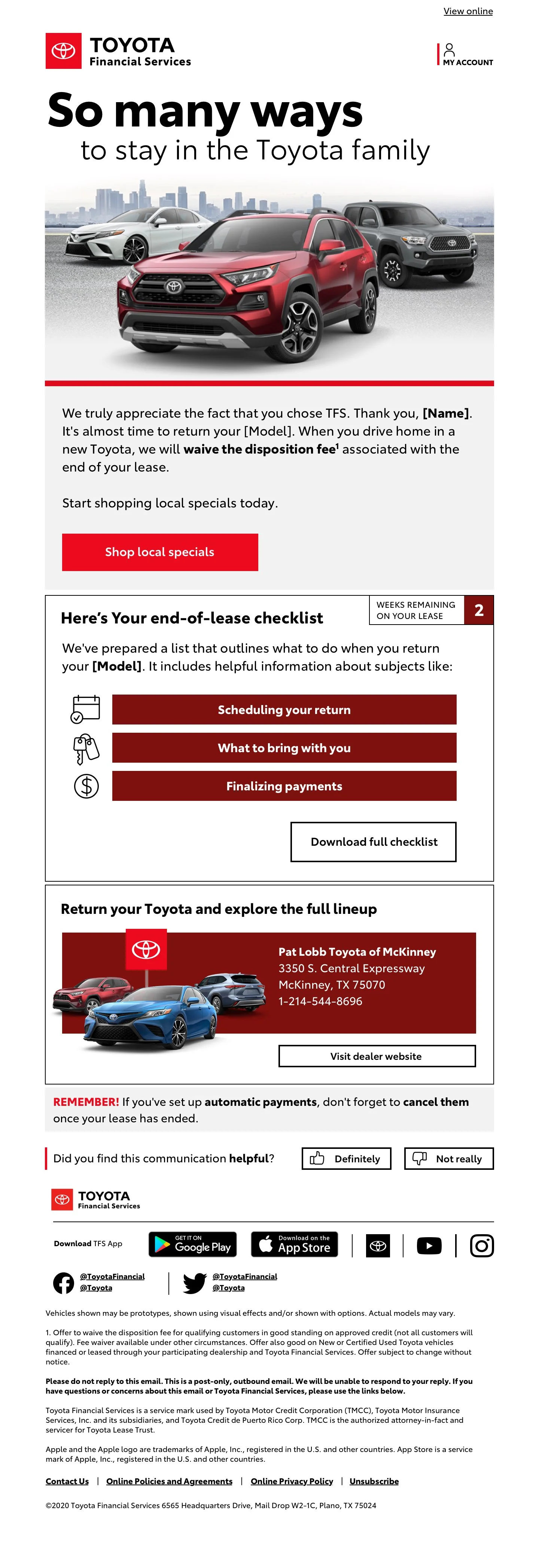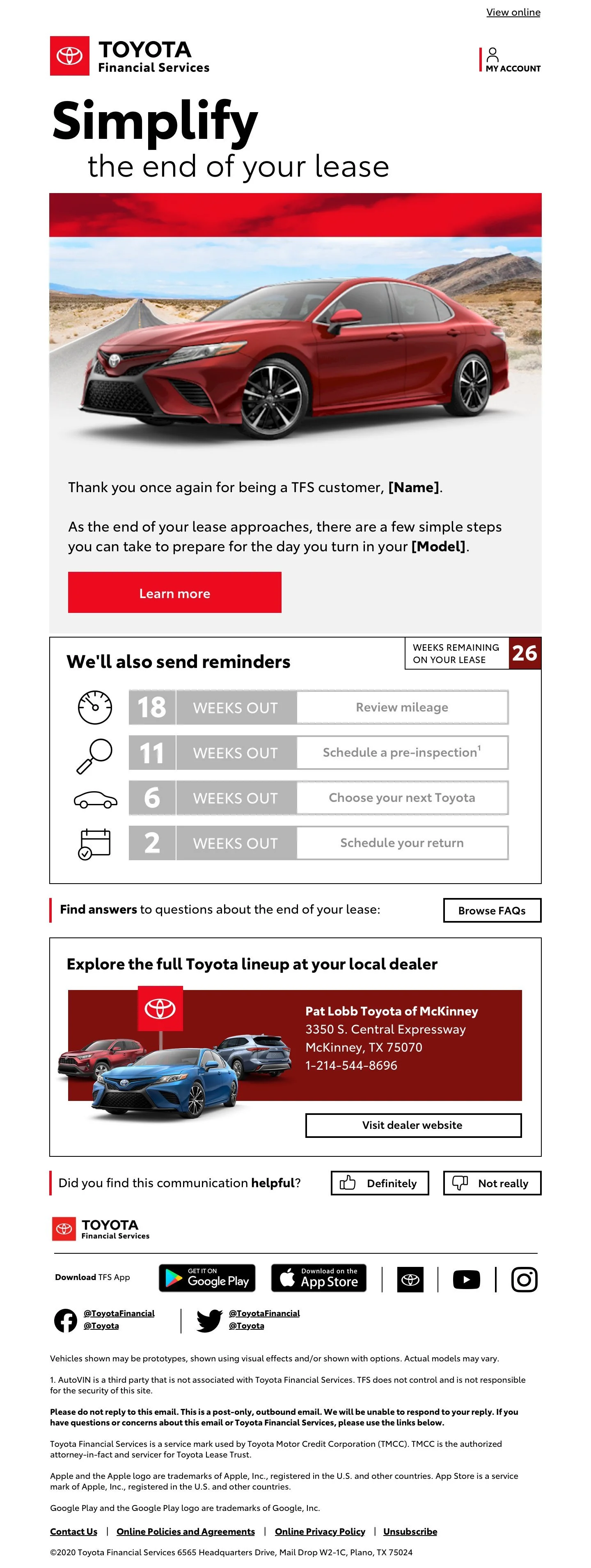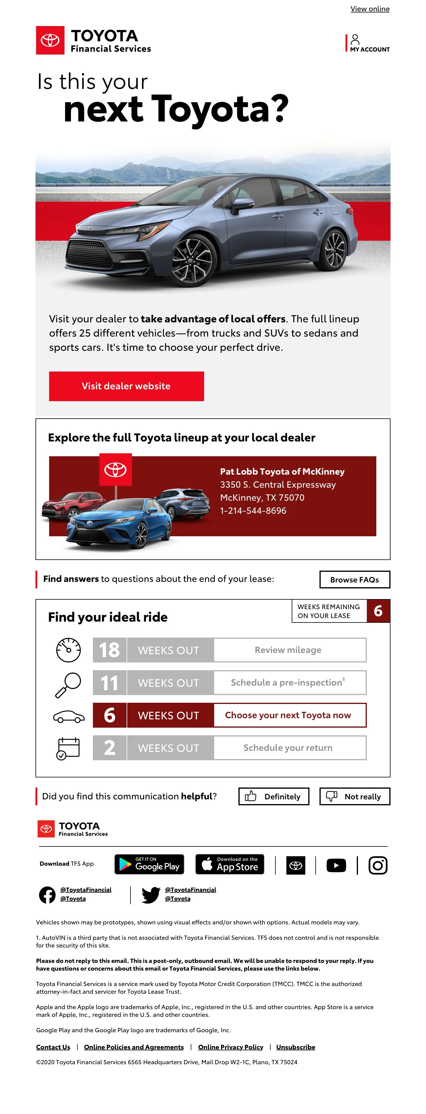 With a year left on their lease, Toyota drivers are guided through their decision to stay within the Toyota family. We created a six-touch email series that starts with personalized reminders and continues with engaging content, encouraging drivers to explore the full Toyota lineup at their local dealer. Each email helps keep them connected to the brand, ensuring they have all the information needed to make an informed choice for their next vehicle.