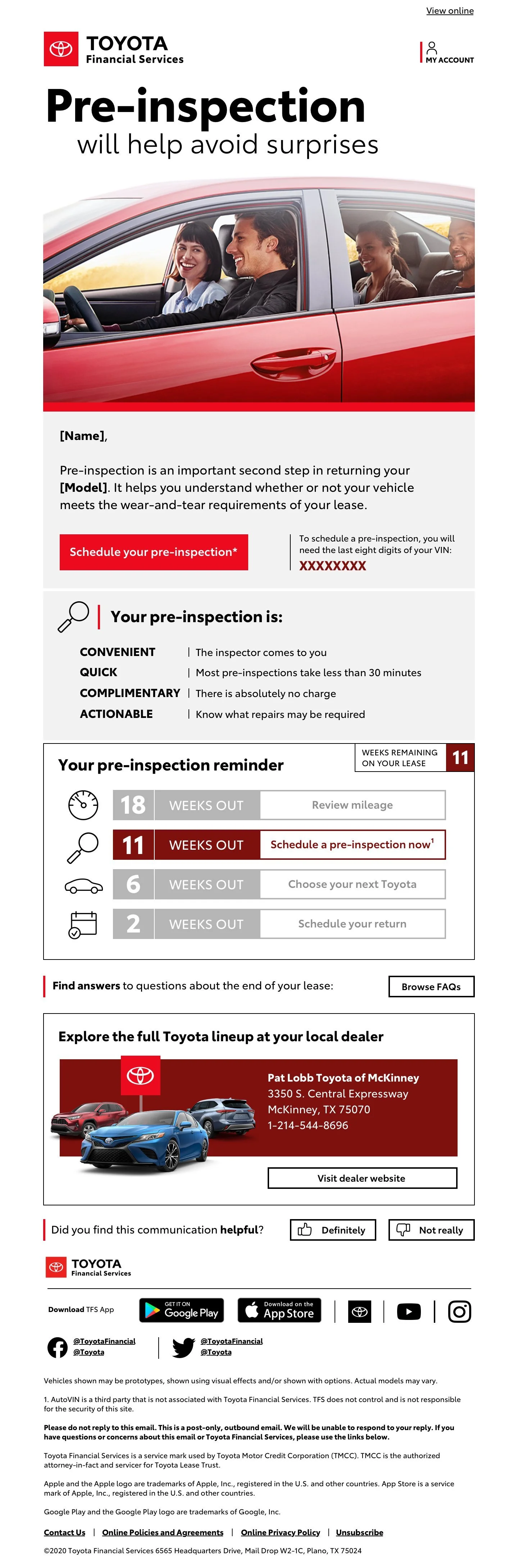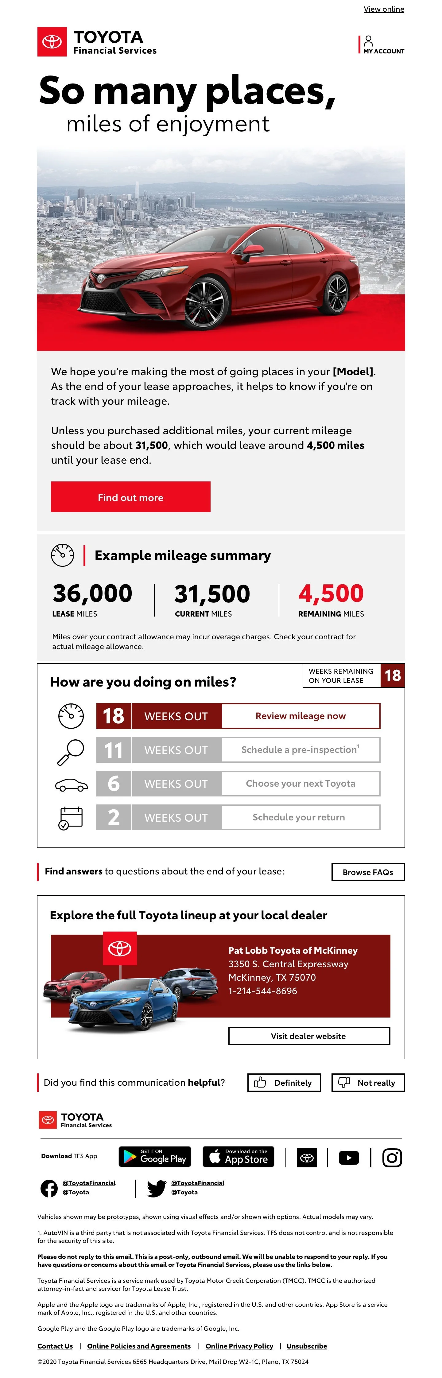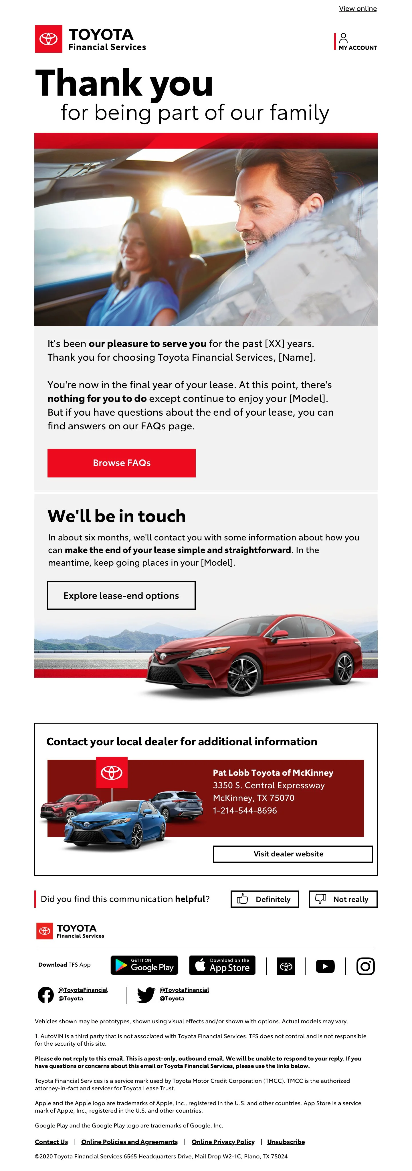 With a year left on their lease, Toyota drivers are guided through their decision to stay within the Toyota family. We created a six-touch email series that starts with personalized reminders and continues with engaging content, encouraging drivers to explore the full Toyota lineup at their local dealer. Each email helps keep them connected to the brand, ensuring they have all the information needed to make an informed choice for their next vehicle.