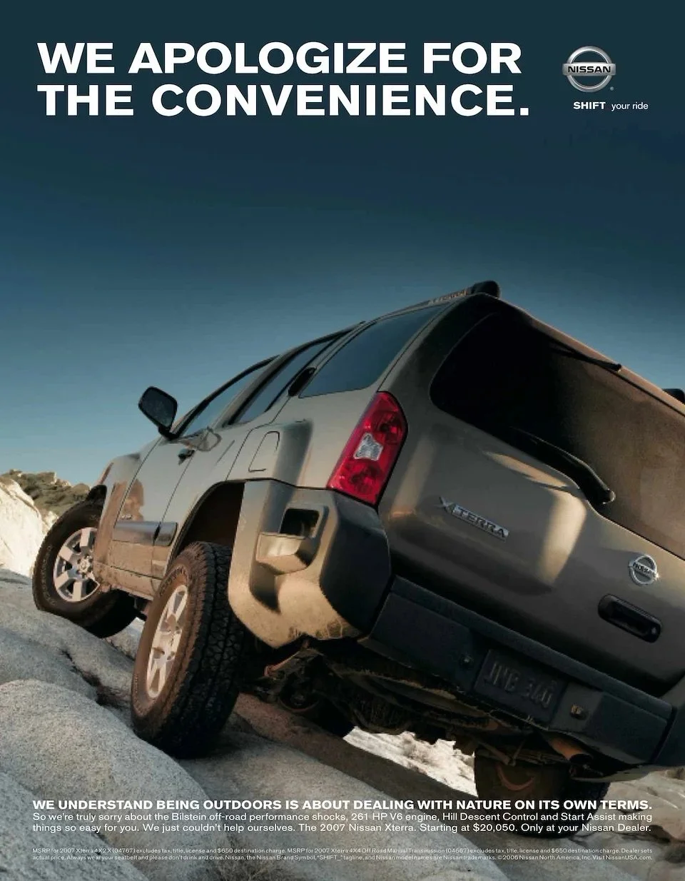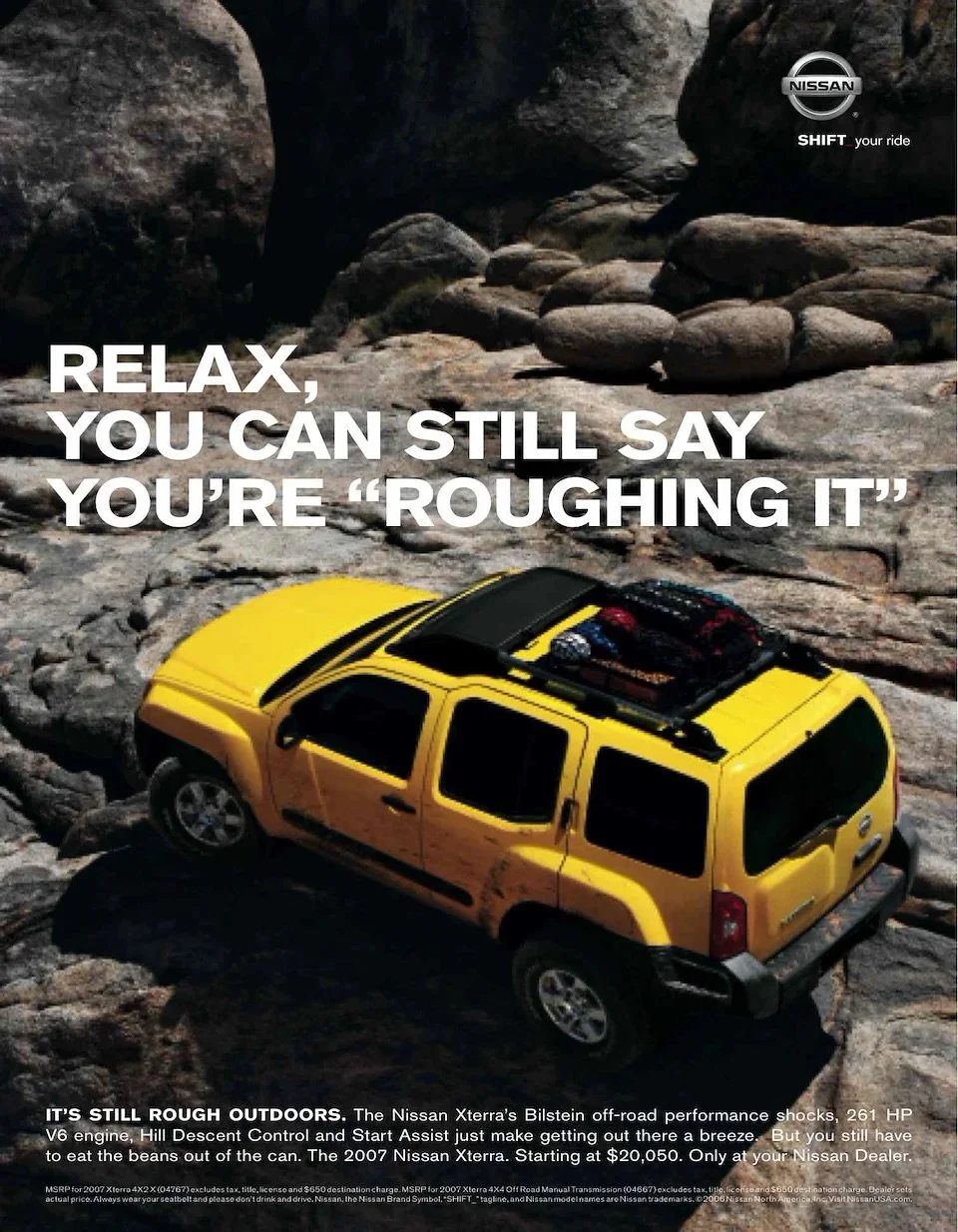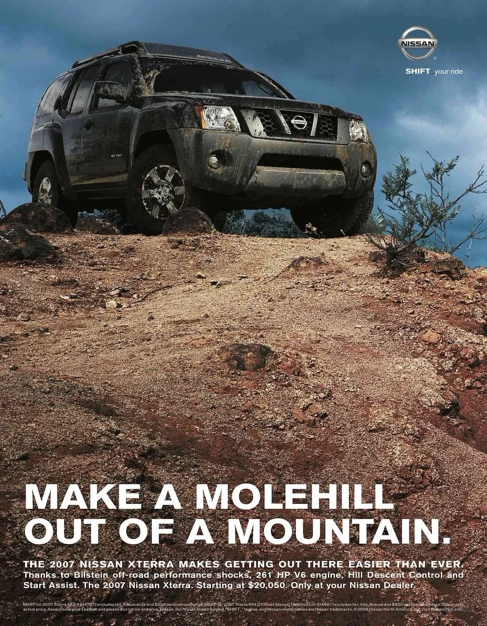 For the 2007 Nissan Xterra, I designed three full-page magazine ads aimed at showcasing the vehicleβs ruggedness and adventure-ready appeal. Each ad was carefully crafted to capture the spirit of the Xterra, using bold visuals and compelling messaging that highlighted its off-road capabilities and versatility for active drivers.